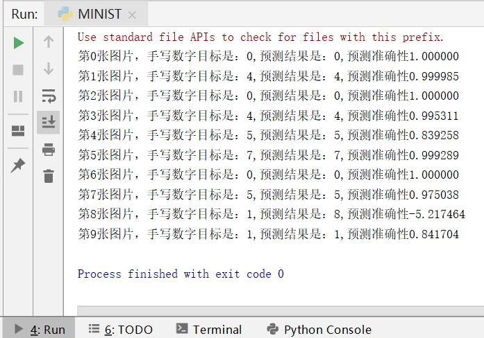 - 基于TensorFlow-CPU框架,搭建了全连神经网络模型,实现了对MINIST手写数据集的识别,准确率可达90%。