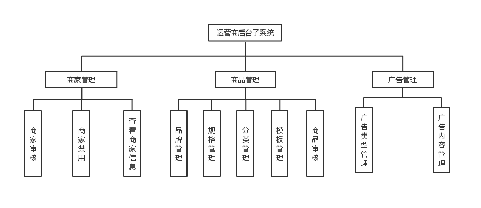 运营商后台是由网站的运营方对商城进行管理的界面,其主要功能包括商家管理,商品管理,广告管理等工作。商家管理主要是对商家的审核与禁用,商品管理包括品牌管理、规格管理、模板管理、分类管理、商品审核,广告管理主要是商城首页中广告展示的管理。