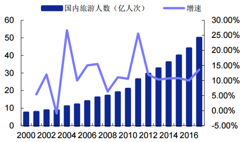 根据国家统计局数据,近年来我国国内旅游市场的游客人数一直保持着稳定增长的趋势,增长率在10%以上,2017年国内旅游市场游客人数已经达到50亿人次。目前我国步入大众旅游时代,旅游休闲已成为百姓的生活常态。除此之外2013-2018年间,国内旅游总收入也在逐年增加,其中2017年中国国内旅游总收入已经达到4.57万亿元。随着旅游用户的不断增加以及消费者消费能力的提升,旅游业整体呈现出欣欣向荣的态势。具体情况如图1.1和1.2所示。