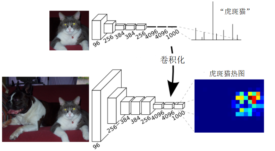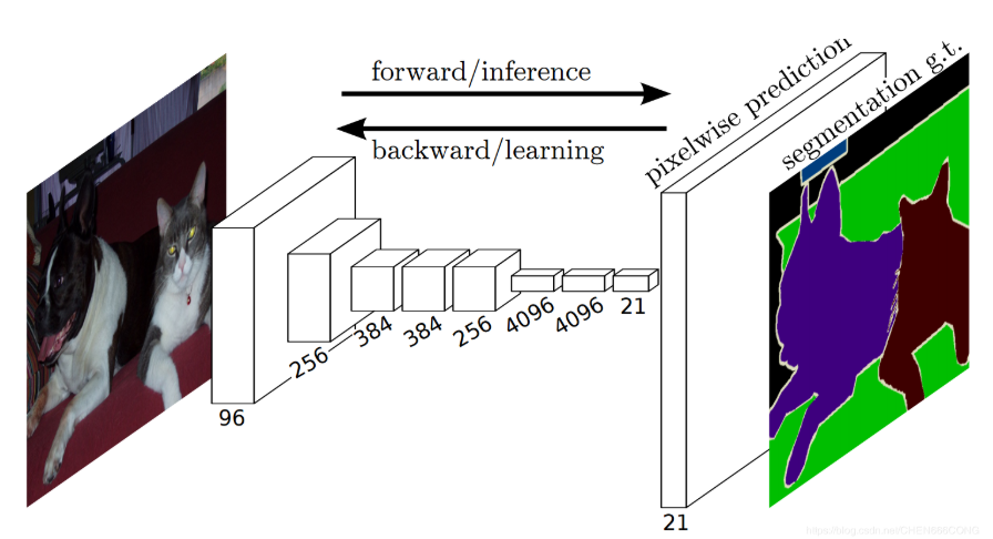 不过滑动窗口的方法有着很明显的缺点,其计算量巨大,存储开销大,窗口大小也是凭借经验选择,整个网络处理速度已经达不到实际的要求。在精度方面由于窗口大小的选择会对最终精度产生巨大的影响,但在实际运算时并不一定能找到最合适的窗口大小,导致最终精度也不能够保证。为了弥补CNN在图像分割问题中的众多缺点,Long等人[1]在CNN的基础上加以修改和深化,全卷积神经网络(FCN)应运而出。FCN的优点在于它在像素这个微小级别的分类中表现出色,将图像分割带入了语义级别的分割领域。由于CNN最后三层是全连接层,FCN就是使用卷积层代替这三个全连接层,并使用上采样对feature-map进行还原,通过这种方式使输出图像的尺寸恢复到与输入图像相同,从而在保留原图空间信息的同时,对每个像素都进行预测和分类,从而实现逐像素操作。一个典型的CNN与FCN的结构与输出差别如图1.2所示。