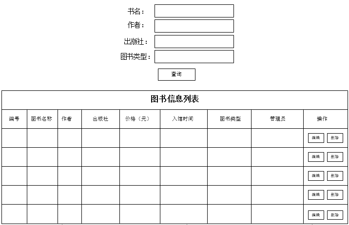 在图书管理模块中,考虑到图书的基本信息虽然千差万别,但是图书类型就那么几大类,所以可以细分为图书信息管理和图书类型管理,下面分别对应着增、删、改、查功能,默认查询所有书籍,信息分页列表显示,也可以通过id,书名,作者等多个条件具体查询。修改完图书类型之后,在添加图书页面通过下拉列表选择。