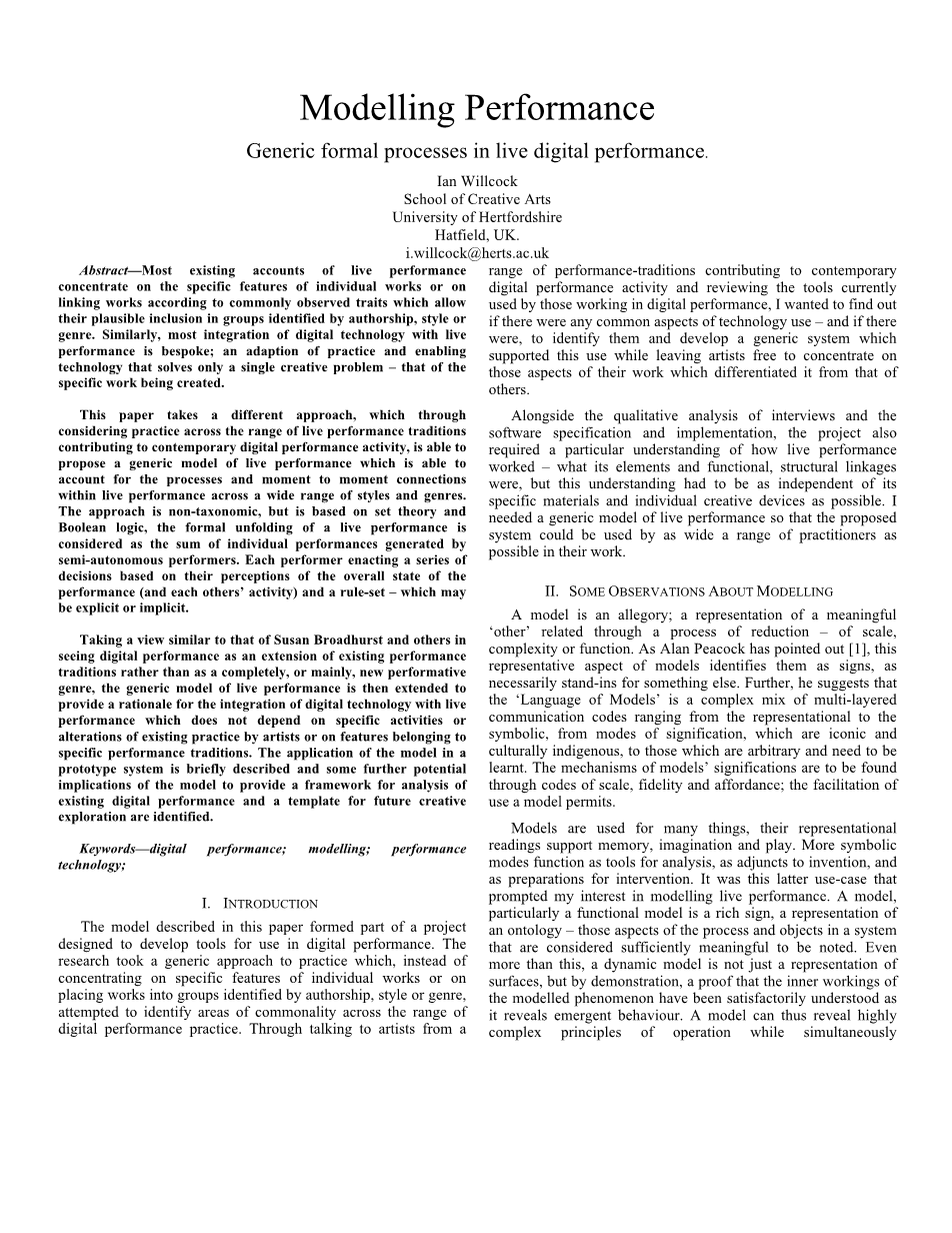 本文采用了一种不同的方法,通过考虑实现当代数字表演活动的现场表演传统的实践,能够提出一种能够解决现场直播过程和时刻的现场表演的通用模型。各种风格和流派的表演。该方法是非分类学的,但是基于集合论和布尔逻辑,现场表演的正式展开被认为是半自主表演者产生的个人表演的总和。每个表演者根据他们对表演整体状态(以及彼此的活动)和规则集的看法制定一系列决策 - 这可能是明确的或隐含的。