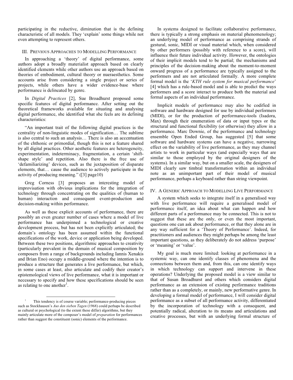 除了这些关于绩效的明确说明之外,还有更多的案例表明,现场表演模式是技术或创意发展过程的基础,但尚未明确阐述;域的本体已经被假定在正在开发的工作,设备或应用程序的功能规范内。在这两个位置之间,创造力的算法方法(尤其是来自包括Iannis Xenakis和Brian Eno在内的一系列背景的作曲家在音乐作品领域中普遍存在)占据了一个中间立场,其目的是产生一种能够产生现场表演的结构。但是,至少在某些情况下,它还能清楚地表达和编纂其创作者对现场表演的认识论观点,重要或必要的内容以及这些规范应如何被视为彼此相关。