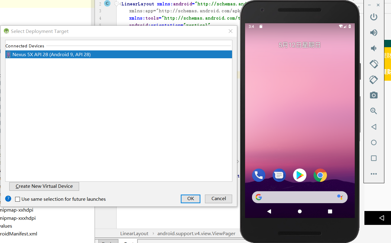 使用Android Studio开发工具中内置虚拟机可进行调试,这里选用设备为Nexus 5X API 28。