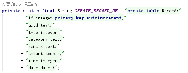 所有涉及数据库的操作都在数据库帮助类中完成,由于支出表与收入表大致相同,以下介绍以支出表为例。支出表创建语句如图2.3.2所示。