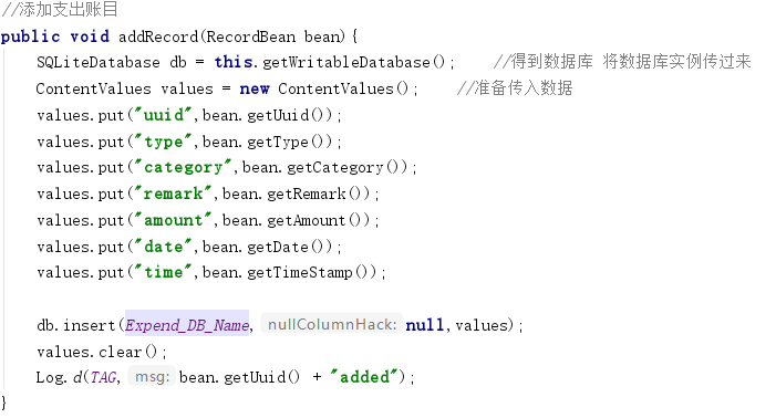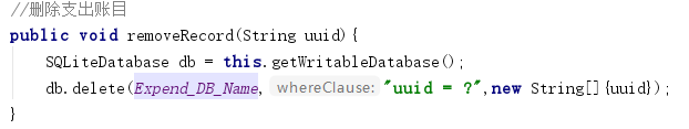 数据库的增删改查方法也写在数据库帮助类中,需自己定义。考虑到App需要保留了增、删、查三个方法,如图2.3.3、2.3.4、2.3.5所示。