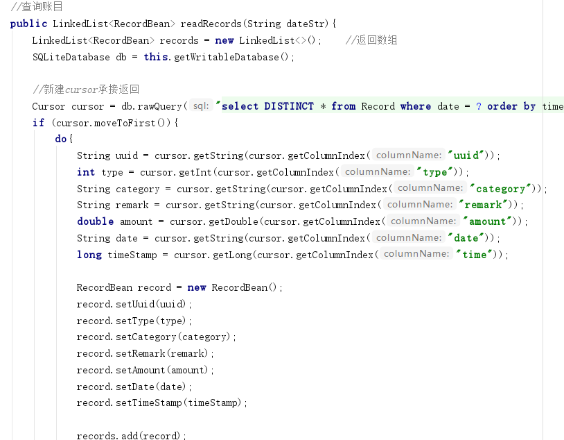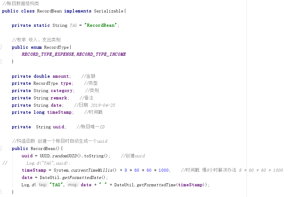 最后介绍自定义账单数据结构RecordBean。由于App基本数据类型是账目,且每条账目有一些特定的属性如金额、收支类型、账单id、备注、日期等,因此使用一个数据结构将这些属性封装在一起将会使得程序结构更加紧凑。这个数据结构包括账目金额、类型、类别、备注、日期、时间戳、账目唯一id等属性,通过接口getter和setter访问和修改账目数据。账目数据结构定义如图2.4.4所示。