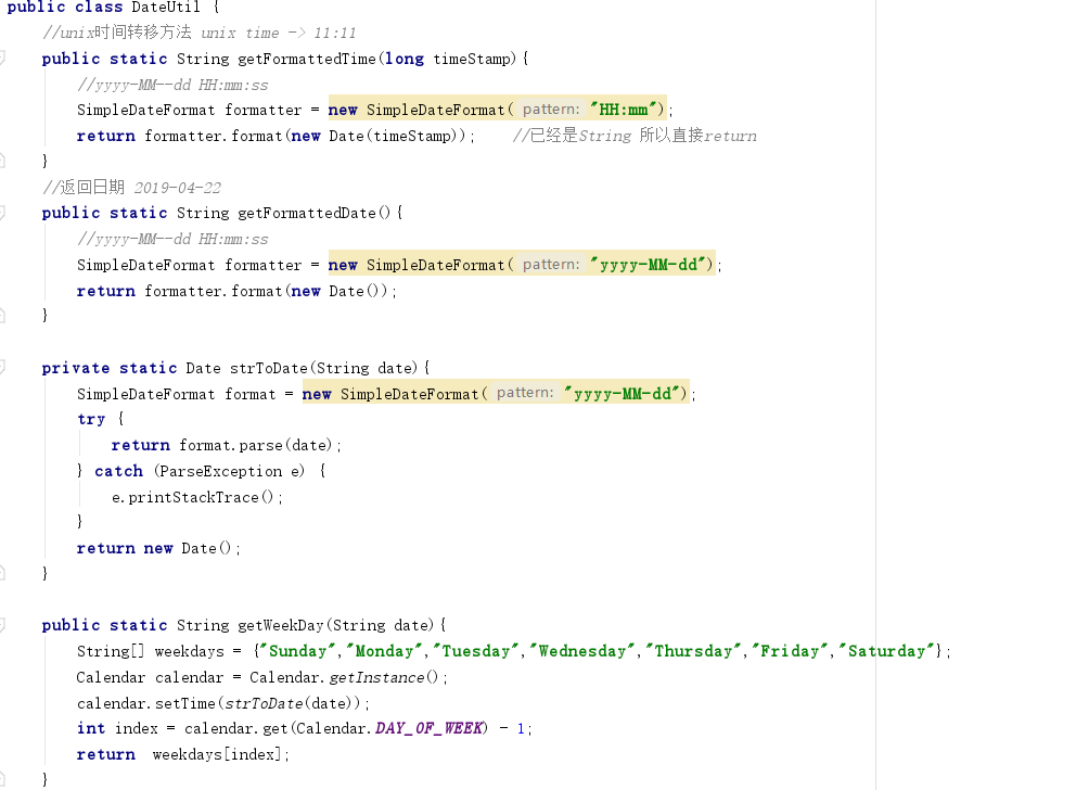 接下来是时间工具类DateUtil,这个类负责获取时间、日期以及日期格式的转换工作,主要有5个方法,分别是用于获取当前时间的getFormattedTime()方法、获取当前日期的getFormattedDate()方法、将日期转化为字符串的strToDate()方法、将日期以自定义格式显示的getWeekDay()方法和getDateTitle()方法。