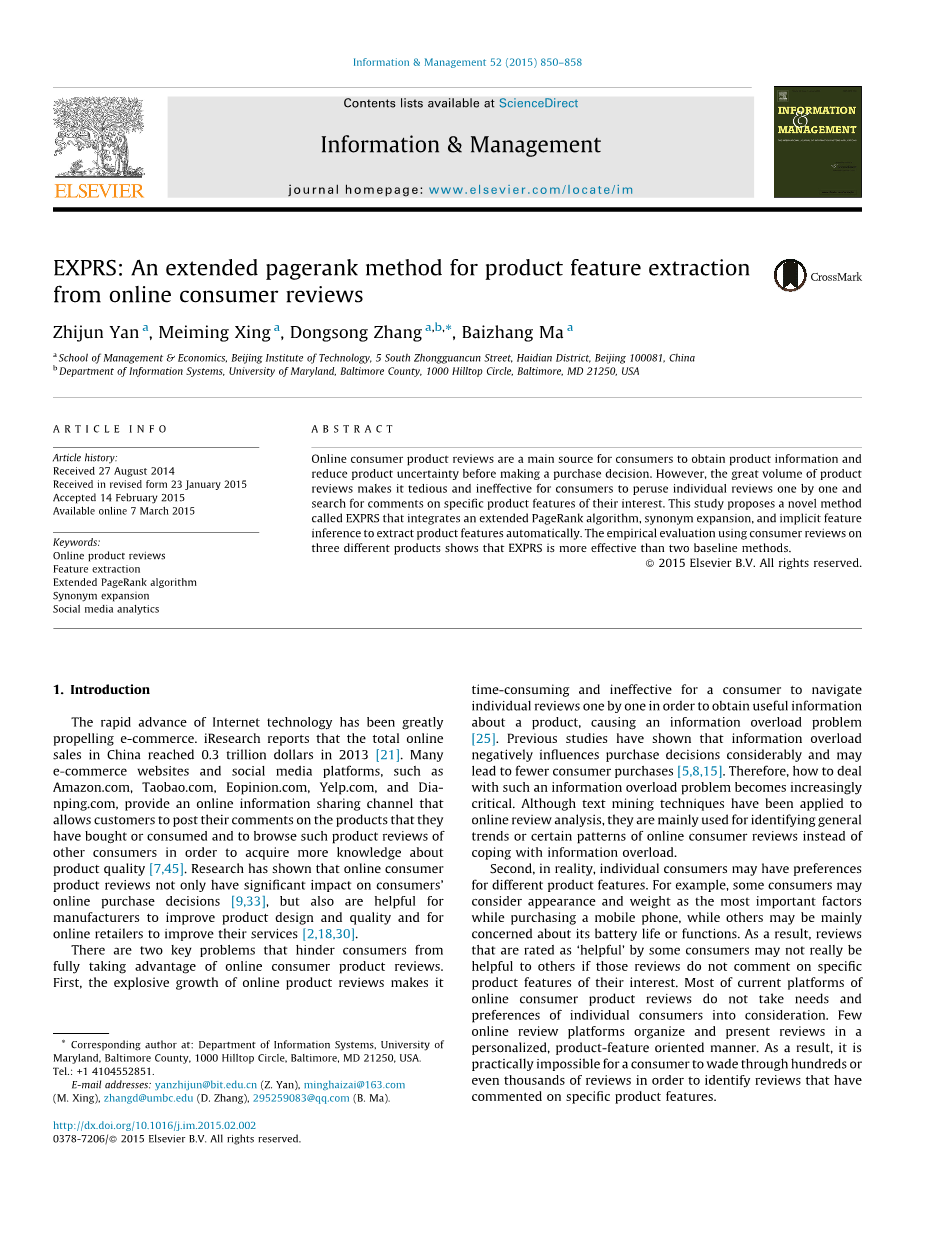 关键词:在线产品评论、特征提取、扩展的PageRank算法、同义词扩展、社交媒体分析
