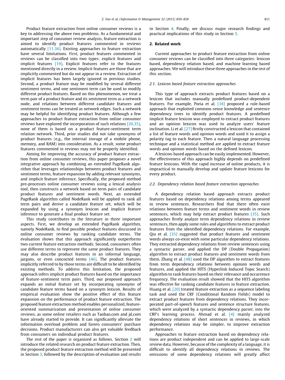 从在线消费者评论中提取产品特征是解决上述两个问题的关键。特征提取是消费者评价分析的基础和重要步骤,其目的是自动识别评论中的产品特征[11,36]。现有的特征提取方法有几个局限性。首先,评论中评论的产品特性可以分为两类:显式特性和隐式特性[19]。显式特性是指在评审中直接提到的特性。隐式特性是那些隐式注释但未出现在评审中的特性。在以往的研究中,隐式特征提取一直被忽视。其次,一个产品特性可以由几个不同的情绪术语来修改,一个情绪术语可以用来修改不同的产品特性。基于这一现象,我们将产品特征及其情感项的术语对视为网络节点,将不同候选特征与情感项之间的关系视为网络边缘。这样的网络可能有助于识别产品特性。虽然有一些从在线消费者评论中提取产品特征的方法探索了这种关系的融合[20,35],但没有一种方法是基于产品特征-情感术语关系网络的。第三,之前的研究没有考虑产品特性的同义词(例如,手机的内部存储、内存和RAM)。因此,评论中涉及的一些产品特性可能无法正确识别。