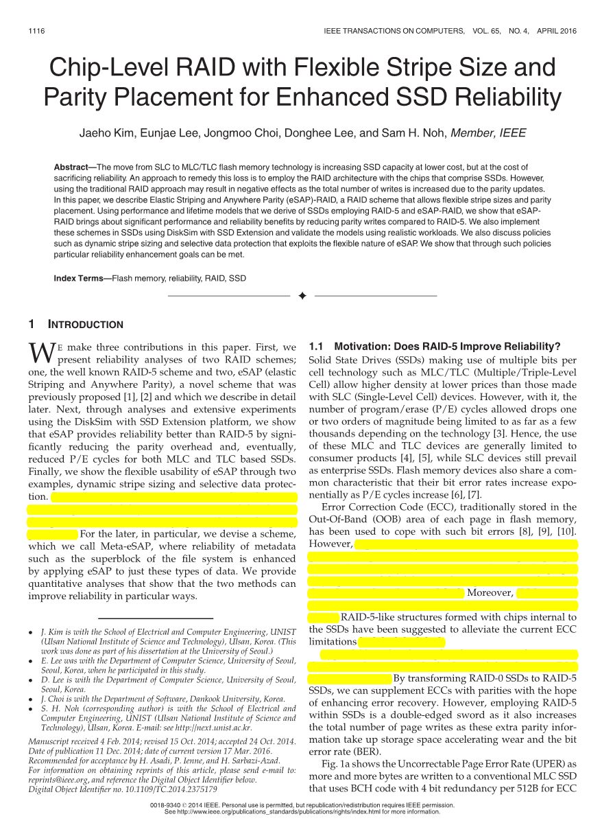本文做出三点贡献。首先,我们提出了两种RAID方案的可靠性分析:一个是众所周知的RAID-5方案,另一个是先前提出的新方案[1][2]eSAP-RAID(弹性条带和随机奇偶校验),我们将在后面详细描述。其次,通过使用DiskSim与SSD扩展平台的分析和大量实验,我们显示eSAP通过显着减少奇偶校验开销提供比RAID-5更好的可靠性,减少基于MLC和TLC的SSD的P/E周期。最后,我们通过两个例子,动态条带大小和选择性数据保护显示eSAP的灵活可用性。动态条带大小是调整条带大小以随着磨损增加而提高可靠性的手段,而选择性数据保护是将特定数据用于奇偶校验保护的手段。对于后者,我们特别设计了一种称为Meta-eSAP的方案,通过将eSAP应用于这些类型的数据来增强诸如文件系统的超级块的元数据的可靠性。我们提供定量分析,显示这两种方法在特定的方式可以提高可靠性。