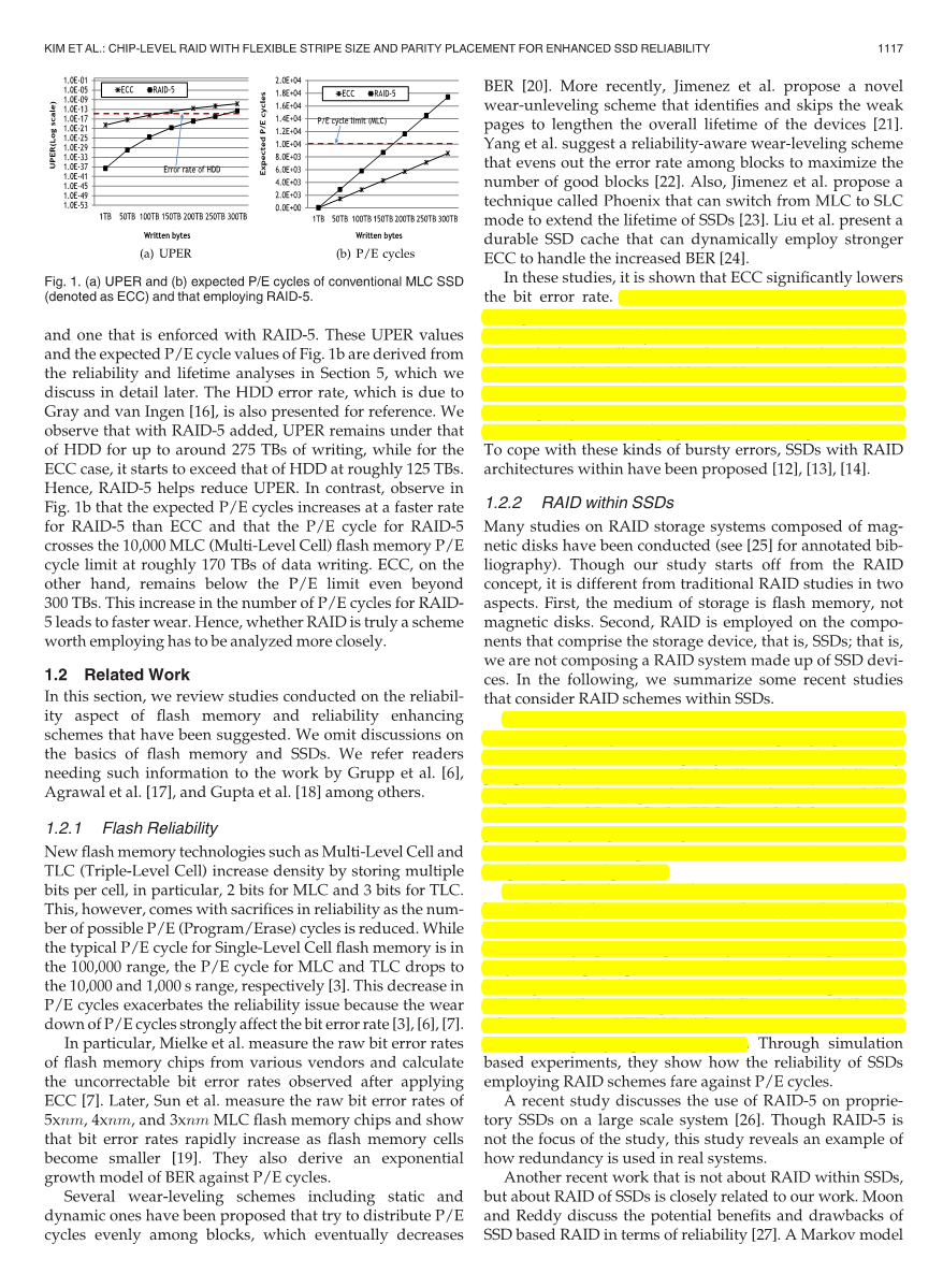 在这些研究中,显示ECC显着降低了误码率。然而,ECC有其局限性。例如,ECC的检测和校正级别是由存储在OOB区域中的ECC的大小来确定,其尺寸小并且必须与诸如逻辑块地址的其它信息共享,以作为突然的功率损耗的保护。因此,超出ECC容量突发差错不能被校正。在类似的情况下,ECC在页面,块和芯片级错误的情况下没有帮助。为了应对这些类型的突发错误,已经提出了具有RAID架构的SSD [12,13,14 ]。