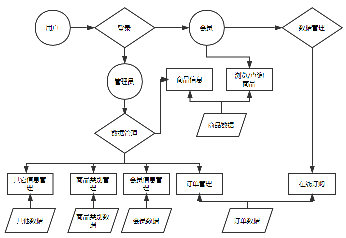 (3)会员管理模块:该模块用来管理会员的信息。用户通过前台销售页面进行账号注册/登录;管理员通过后台管理系统对会员信息进行管理(查看或者删除),并且为不同等级的会员提供与其等级相应的优惠服务。