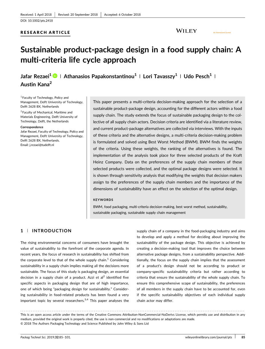 消费者日益关注的环境问题使可持续发展的价值成为企业议程的重中之重。近年来,可持续性研究的重点已从公司层面转移到整个供应链层面。1 考虑供应链的可持续性意味着使所有决策更具可持续性。本研究的重点是包装设计,这是产品供应链中的一项重要决策。Azzi等人2 确定了包装设计中五个具有重要意义的特定方面,其中一个方面是“可持续性的包装设计”。考虑到食品相关产品的可持续性已被一些研究人员发现是一个非常重要的主题。3,4 )本文分析了食品包装行业公司的供应链,旨在开发和应用一种决定改善包装设计可持续性的方法。这一目标是通过创建一个决策工具来实现的,该工具从可持续发展的角度改进了替代包装设计之间的选择。此外,对供应链的关注意味着对产品设计的评估不应该根据产品或公司特定的可持续性标准,而应该根据确保整个供应链可持续性的标准。为了确保这种全面的可持续性,即使每个供应链参与者的具体可持续性目标可能不同,也必须考虑供应链中所有成员的偏好。