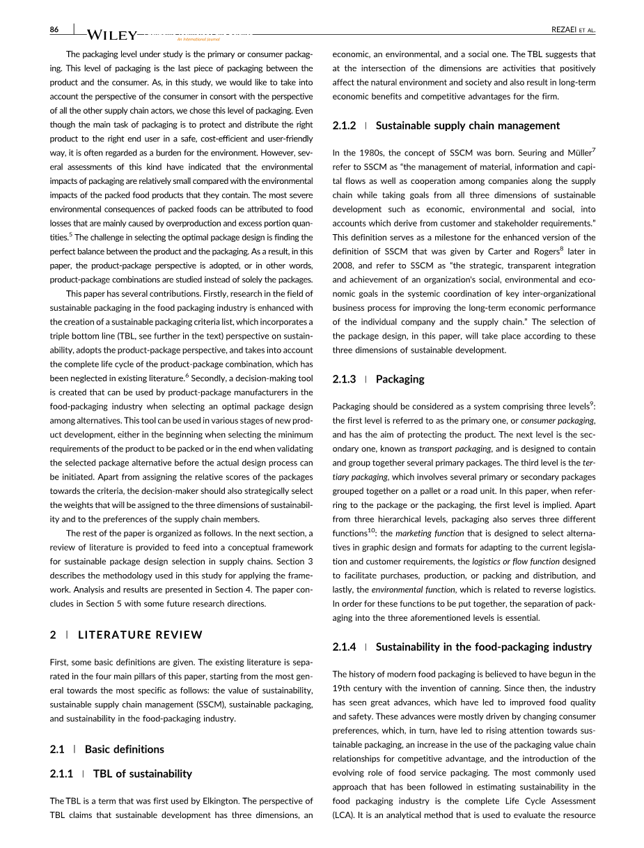正在研究的包装水平是主要或消费者包装。这种包装水平是产品与消费者之间的最后一揽子包装。在本研究中,我们希望从所有其他供应链参与者的角度考虑消费者的视角,我们选择了这种级别的包装。尽管包装的主要任务是以安全,经济和用户友好的方式保护和分发正确的产品给正确的最终用户,但它通常被视为环境的负担。然而,这种评估表明,与它们所包含的包装食品的环境影响相比,包装对环境的影响相对较小。包装食品造成的最严重的环境后果可归因于食品损失,这主要是由于生产过剩和产量过剩造成的。5 选择最佳包装设计的挑战是在产品和包装之间找到完美的平衡。因此,在本文中,采用了产品包装的角度,换句话说,研究产品包装组合而不仅仅是包装。本文有几个贡献。首先,通过创建可持续包装标准清单,加强食品包装行业可持续包装领域的研究,该清单包含三重底线(TBL,见文中详见)可持续发展的观点,采用产品包装透视,并考虑到产品 - 包装组合的完整生命周期,这在现有文献中已被忽略。6 其次,创建了一个决策工具,可供产品包装制造商在食品中使用 - 包装行业在替代品中选择最佳包装设计时。该工具可用于新产品开发的各个阶段,或者在选择要包装的产品的最低要求时开始,或者在开始实际设计过程之前验证所选择的包替代品时最终使用。除了将标准包的相对分数分配给标准外,决策者还应该战略性地选择将