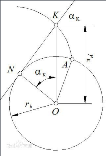 其中αk为齿轮压力角,NK为齿轮啮合线。由αk=arccos(KO/NA)可以从图2.1看出渐开线上每个点的压力角是不同的,离基圆越远,压力角越大。基圆上的压力角为0,这里设置分度圆上的压力角为20度。