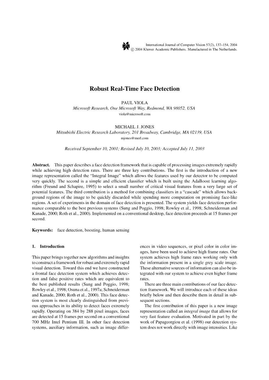 这篇文章提出了一种新算法和对于构建具有鲁棒性并且运算速率极快的视觉检测框架的思想。为此,我们构建了一个检测正脸的系统,它可以实现人脸检测并且误报率与目前发表的最好实验结果相当(Sung and Poggio, 1998; Rowley等., 1998; Osuna等., 1997a; Schneiderman and Kanade, 2000; Roth等., 2000)。这个人脸检测系统与以前的方法相比其最显著的优点是它快速检测脸部的能力。在传统的奔腾3处理器上(主频700MHZ)处理像素点288到384的图像,其脸部检测速率可以达到每秒15帧。在其他的人脸检测系统中,一些辅助信息,如在视频流中图像的不同或者彩图中像素点的颜色都被运用来实现快速的人脸检测。我们的系统只需要图片包含的信息为单一的灰度值就能实现高帧率的人脸检测。这些其他的信息源也可以集成在我们系统中从而达到一个更高的检测帧率。
