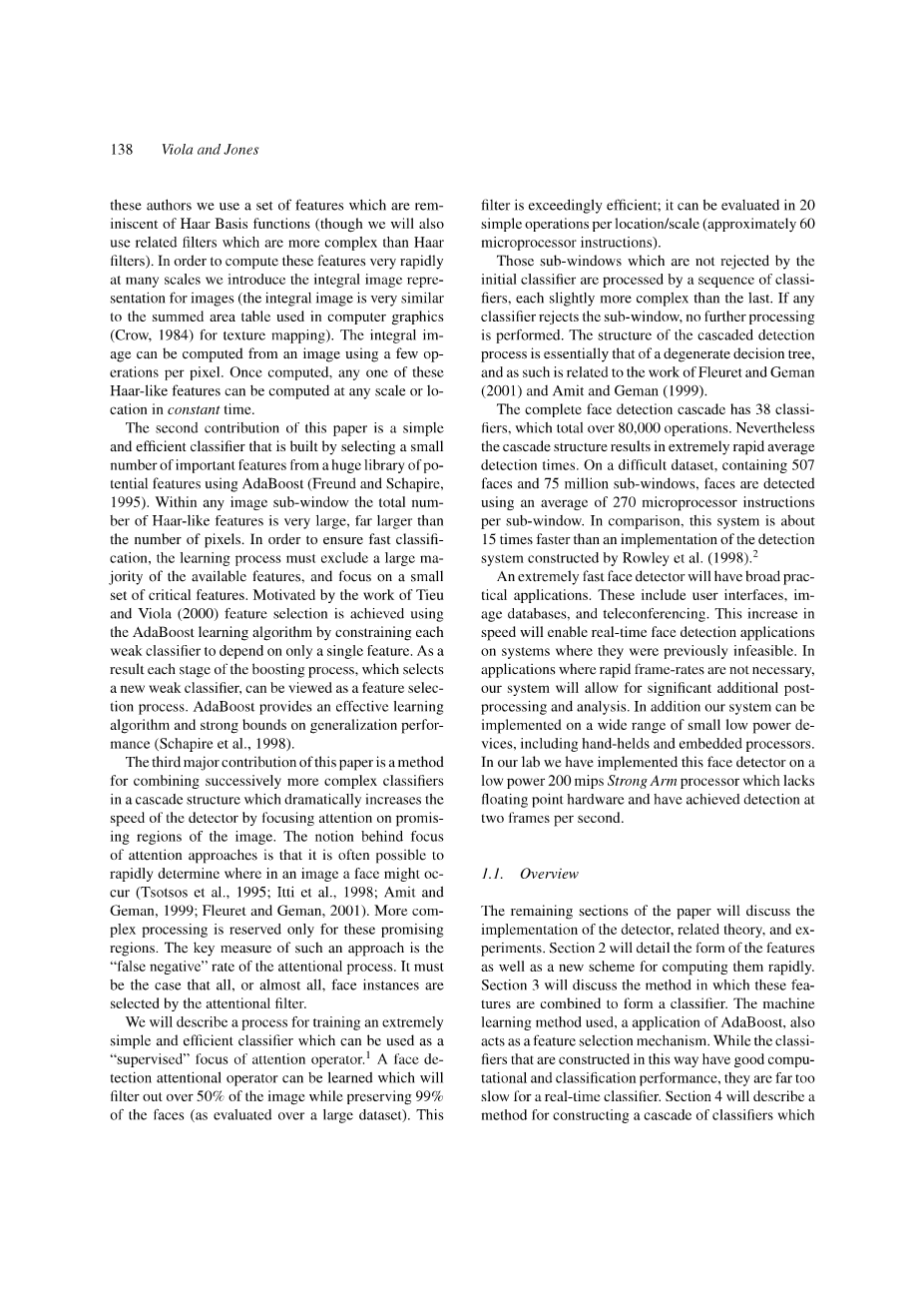 这篇文章的其余部分都是在讨论如何实现这个检测器,以及其所依靠的理论与实验。第二节详细介绍这些特征的形式以及快速运算它们的新方法。第三节将要讨论将这些特征组合建立分类器的方法。机器学习的方法是利用Adaboost,也作为一种特征选择的机制。虽然以这种方式构建的分类器有很好的运算速率与分类能力,但是它们相对于实时分类器还是太慢。第四节我们将要讲述构建一个串级分类器的方法,它们串联在一起可以形成一个极其迅速并且有效的检测器。第五节讲述了大量的实验结果,包括对于我们实验方法的详细说明。最后第六节包括了对于这个系统讨论与其他相关系统的关系。
