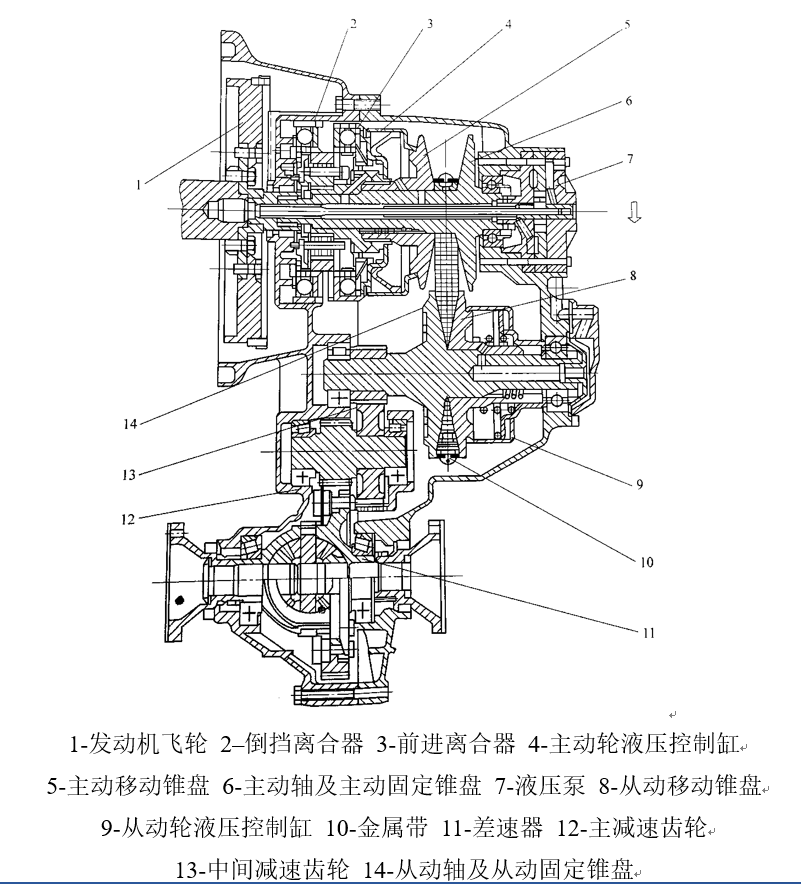 汽车金属带式无级变速器的结构如图2.1所示,有负责动力传入的起步离合器,可以实现离合换向的行星齿轮机构,作为CVT核心部件的金属带轮和金属带,电液控制系统和调整CVT传动比的中间减速齿轮。