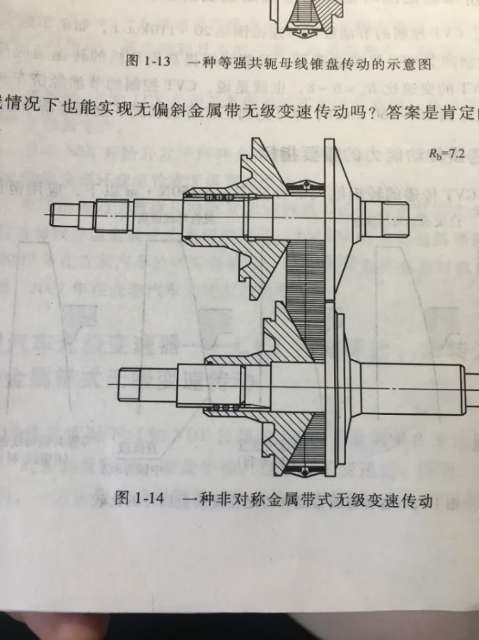 目前金属带式无级变速器面临的技术难点主要在于——直母线锥盘使金属带产生偏斜而导致传动比调整不够精确,以至于可调节的传动比范围受限制。至今投产的大部分CVT中,锥盘(带轮)的工作表面都选用直母线锥面,V形摩擦片的侧边均为直线。因为这样给生产过程带来了便利,加工简单。但选用直母线锥盘,必定会使金属带在变速过程中产生轴向偏移。查阅资料可得金属带偏斜量会随着最小工作半径的增大而增加,也就是说,随着变速比的增大,金属带的偏斜量就会增加。不难得知,直母线锥盘限制了金属带式无级变速器的变速比和承载能力。所以说,实现汽车CVT的大变速比和大转矩的关键就在设计无偏斜的金属带传动——曲母线锥盘、复合母线锥盘和等强度共轭母线锥盘。但是不言而喻,曲母线和复合母线锥盘制造难度和生产成本就比直母线锥盘高太多。当然,直母线情况下也能实现无偏斜金属带传动,中国专利双钢环非对称金属带式无级变速传动装置,其设计就是利用一个平盘和一个锥盘这种非对称结构形式避免金属带产生偏斜,如图2.2所示。