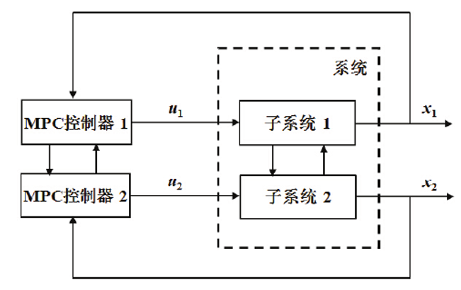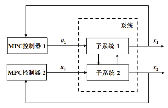无人驾驶车辆的控制作为一个复杂的带各类约束(运动学约束、动力学约束、路况约束等)的控制系统,对控制器设计的实时性要求也是非常高的,一旦控制系统的处理速度跟不上行驶过程的数据刷新需求,就会导致难以想象的灾难性后果。尤其是本文重点研究的车辆间协同控制系统,安全性问题更值得关注,而队列系统的数据量相对于单一无人驾驶车辆倍增,这就使得优化问题的计算规模也大大增加,常用的集中式整体求解方法若是要同时满足上述要求,需要计算机有极高的运算处理速度,对硬件性能要求非常高。因此为了考虑成本和工作效率,本文将采用分布式模型预测控制(Distributed Model Predictive Control,DMPC),对于车辆队列间的协同控制网络这种复杂而高维的控制系统,就可以将其整体求解问题分解成多个子系统(单一车辆间)的分布求解问题,同时各个子系统之间再通过特定的联络方式,完成实时通讯与信息交互,从而降低了问题的规模和复杂性,并从各方面提高了系统的控制性能。