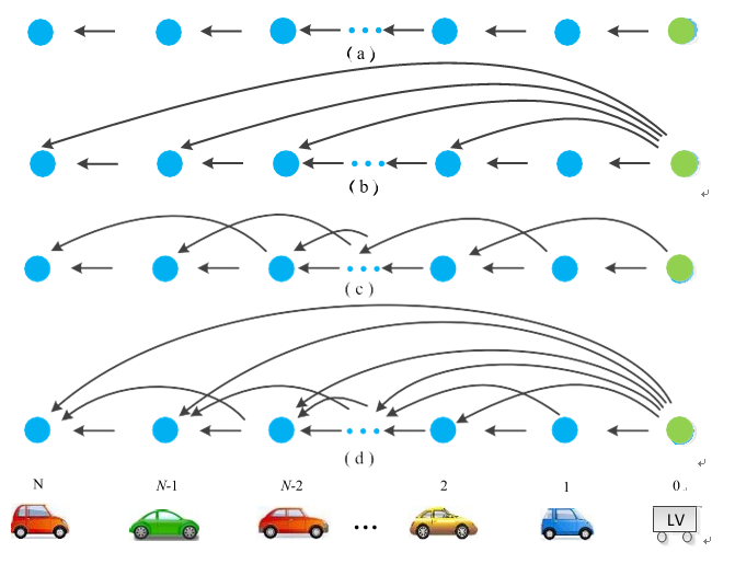 有关无人驾驶车辆的研究已经成为了新时代最火热的话题之一,而与此同时,相关的自动驾驶汽车的协同控制问题也在近些年受到热切关注[23]-[29],这也主要是因为车辆队列的协同控制在改善交通运输状况、提高交通效率、提高道路安全性、减少能源消耗,降低环境污染等方面有着巨大潜力[23] [24]。协同控制的主要目标是确保队列内的车辆在一定的行驶规律下,均以设定的车速行驶,同时行驶过程中连续跟随车辆之间保持预设的间距不变[27]-[29]。最早的队列控制可以追溯到十九世纪八十年代美国加州的“PATH”计划,开展了一系列车辆间通信的协同控制实车道路试验,如文献[1]中PATH计划提出后的十年内开发的自动化高速公路系统(AHS)的设计: AHS是一个庞大复杂的系统,车辆可以自动控制。文中详细讲述了AHS的设计和实施方法,同时表明该方面的研究要求执行器和传感器等技术的进步,以及对大型分层混合控制系统的设计,分析,模拟和测试。文中重点介绍多层AHS控制体系结构和一些实现问题,详细讨论了车载控制系统的设计和安全验证以及交通队列控制器的设计。该计划随后也提出了许多有关传感器与执行器、控制结构、非集中式控制、车辆队列控制稳定性等方面的著名论题[27]。