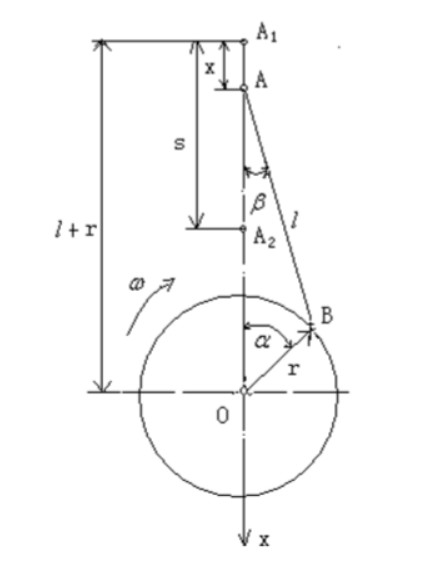 在柴油机中,使用最多的就是中心曲柄连杆机构,其结构简图如图2-1所示,在柴油机运行时,活塞做往复直线运动,曲轴做旋转运动,连杆则做复合运动[1]。在图2-1中,O为曲轴中心,A为活塞,AB表示连杆长度为L,OB表示曲柄半径为。