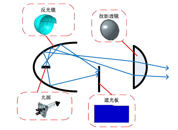 PES前照灯采用成像的方式产生规定的光型,其结构由反光镜,光源,透镜和遮光板构成,如图1.1所示。PES前照灯的反光镜为椭球型,光源安装在第一焦点处,遮光板安装于第二焦点处。第一焦点处发射的光线经反射汇聚于第二焦点,遮光板挡住明暗截止线上方的光线,产生所需的光型[18]。