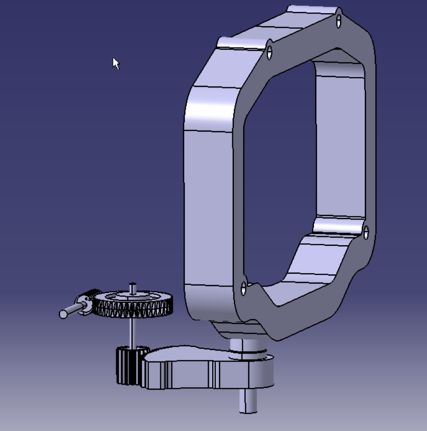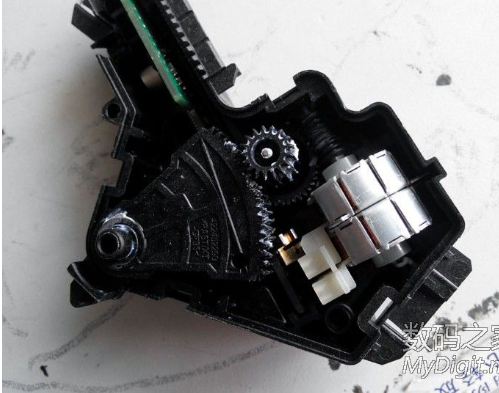 前照灯的随动调节通过执行机构来实现。法雷奥自适应前照灯的执行机构包括一个步进电机、一对蜗轮蜗杆传动副和一对齿轮传动副,如图1.3所示。此传动链的末端零件由两片扇形齿轮拼合而成,中间夹有U型金属片。扇形齿轮与转向随动支架间通过滑动接头连接,扇形齿轮转动带动随动支架作水平转动。随动支架正上方安装有枢轴,其轴线与扇形齿轮转动中心对心。