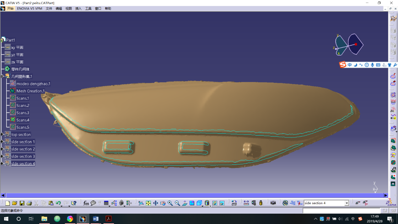 汽车前照灯的一般设计流程分为:标准化光源型号的选定;透镜和反射镜的设计;前照灯造型设计。针对于具体车型尺寸及照明要求,可以快速确定标准化光源的类型,而对于不同光学结构的前照灯系统,其反射镜设计和壳体设计才是最关键也是最困难的环节。国外专业前照灯公司已经研制开发出前照灯专用设计软件,可以根据汽车外形尺寸及光学性能要求,自动得到最优化的反射体结构,并且在前照灯底座和灯罩壳体的设计上积累了大量的经验。国内如果要设计一款全新的前照灯,使其配光性能优秀,底座和灯罩壳体注塑工艺性好,将会耗时费力,使产品开发周期增长,设计投入增大。而采用逆向设计的方法,在已有的优秀前照灯产品的基础上,进行结构性能分析,模型重构,优化设计,将会缩短产品的开发周期,并减少设计投入。