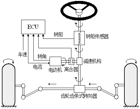 如图2.1所示,转矩传感器一般被安装在在转向轴中间。当驾驶者转动转向盘时,转向盘带动转向轴随之转动,此时转矩传感器就会将检测到的转矩信号信号传输给电子控制单元(ECU)。随后ECU根据接收到的信号计算出此时所需要的辅助转矩,并将结果转化为信号发送给电动机。电动机收到信号后再通过离合器和减速机构将放大后的转矩作用到转向轴上。这整个过程都是实时的,所以能够实现对转向所需的助力的实时控制[4]。