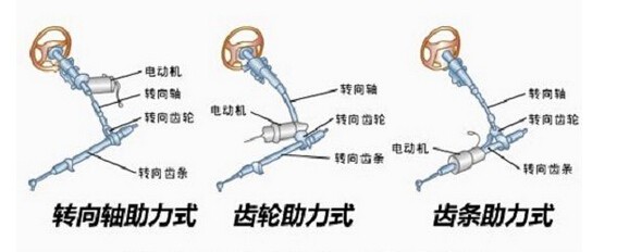 在EPS中,电动机可以根据需求安装在不同位置上,根据安装位置不同,可以分为三种助力方式:电动机安装在转向轴处的转向轴助力式,电动机安装在转向器小齿轮处的小齿轮助力式以及电动机安装在齿条处的齿条助力式。