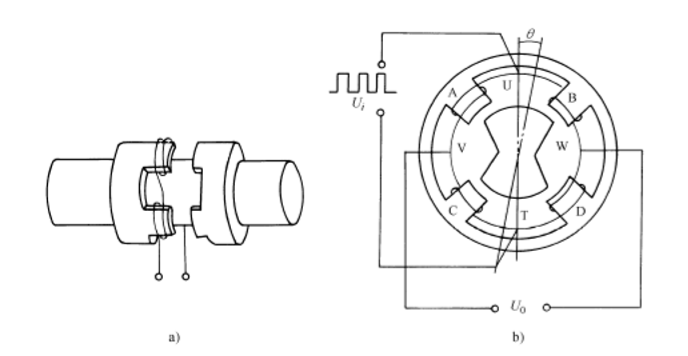 转向力矩传感器通常用来测量转向盘与转向器之间的转向力矩,其结构如图2.4所示。 在A、B、C、D四个极靴上分别绕有线圈,形成一个回路。在回路的U、T两端输入脉冲电压Ui,当驾驶者没有转动转向盘时,施加在转向轴上的转向力矩为0,则转子和定子的相对转角也为0。那么此时A、B、C、D四个极靴上的磁通量相等,在V、W两端的电位差U0为0。但是当转向杆上的转矩不为0时,转子和定子之间就会产生相对转角θ,A、B、C、D四个极靴上的磁通量就会发生变化,使V、W之间的电位差U0发生变化,而U0又与Ui和θ成正比。所以就能通过测量U0得到转向力矩[5]。