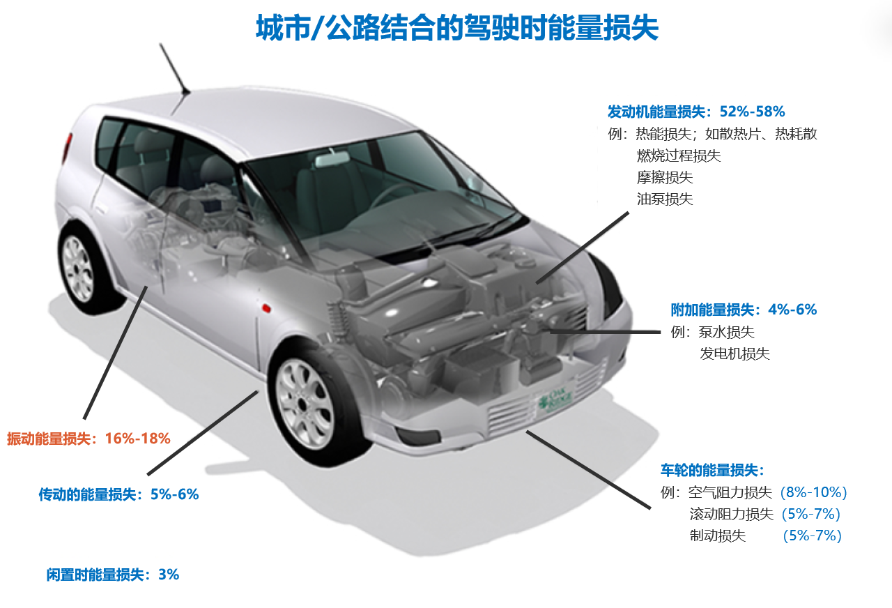 汽车产业是我国的支柱型产业之一,在“工业4.0战略”以及“中国制造2025”的大背景下,我国汽车行业正朝着“轻量化”、“智能化”、“网联化”、“电动化”的大方向迅速发展[1]。我国在发展新能源汽车技术上投入了大量人力物力资源,同样取得了丰硕的成果。但是在目前的电池技术的限制下,纯电动车的连续行驶里程仍难以满足用户的需求[2]。但是电池技术在近几年的研究中也未取得革命性的突破,因此成为了新能源汽车发展过程中的瓶颈[3]。在此背景下,探索汽车能源新的补给方案,丰富汽车能源构成,对推动新能源汽车技术的发展具有重要意义。根据美国能源部数据统计,如图1.1所示,在汽车的正常行驶过程中,只有大约10-16%的燃油能量用于车辆的行驶驱动,其中大部分的能量损耗在于发动机的热效率较低,而汽车在行驶过程中消耗在悬架部分的振动能量约占汽车发动机输出总能量的16%-18%[4],传统减振器通过将悬架振动的机械能转换成热能的形式耗散掉,若将这部分能量加以回收,不仅可以改善汽车的燃油经济性,如果通过相应控制方法加以控制根据不同路面激振力改变减振器的阻尼力,还能够提升车辆的操纵稳定性和乘坐的舒适性[5]。因此,近年来馈能式减振器受到了大量学者的关注。