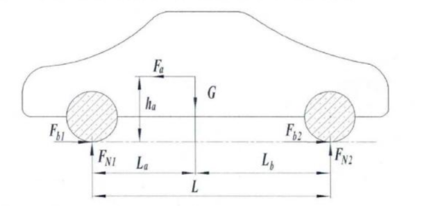 在忽略汽车所受到的空气阻力、坡度阻力、滚动阻力对汽车的影响的条件下,图3.1分析了汽车在水平道路上进行制动时的受力状况。