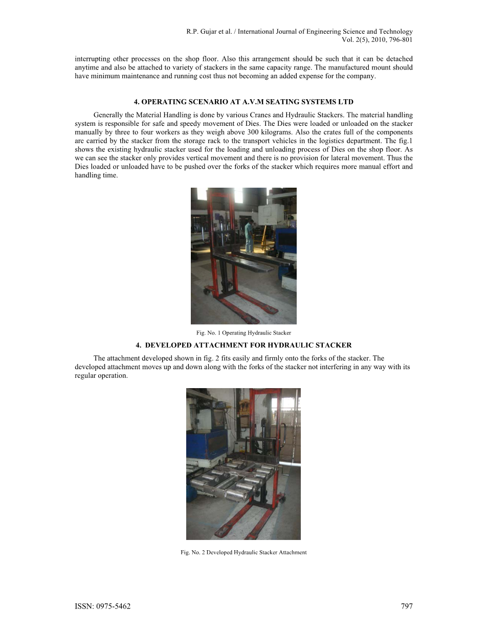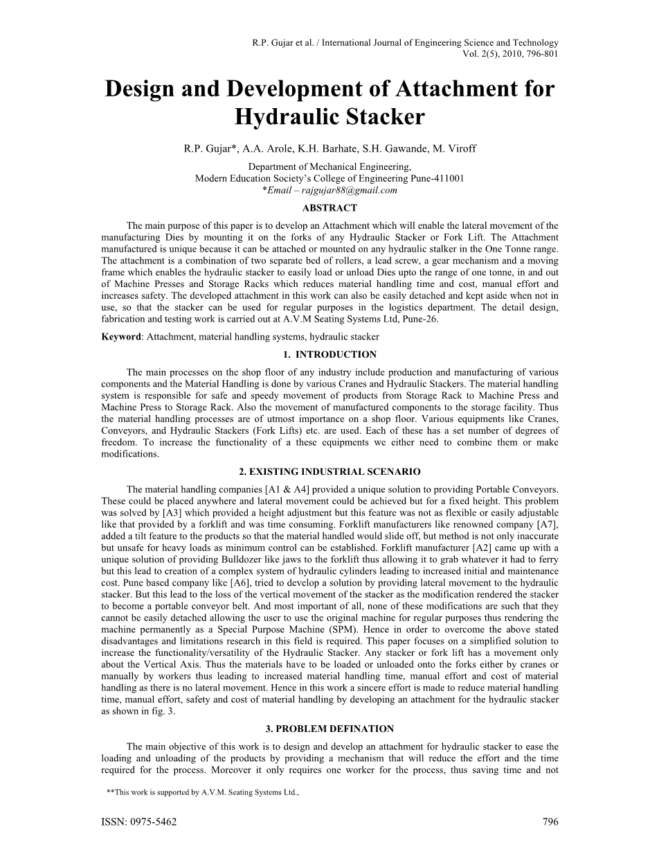 该附件由两个独立的辊床、一个丝杠、一个齿轮机构和一个移动框架组成,使液压堆垛机能够轻松地装载或卸载1吨范围内的模具、进出机压机和存储架,从而减少了材料处理时间和成本、人工操作,并提高了安全性。这项工作中开发的附件也可以很容易地分离,并在不使用时放在一边,以便堆垛机可用于物流部门的常规用途。详细设计、制造和测试工作在A.V.M座椅系统有限公司Pune-26进行。