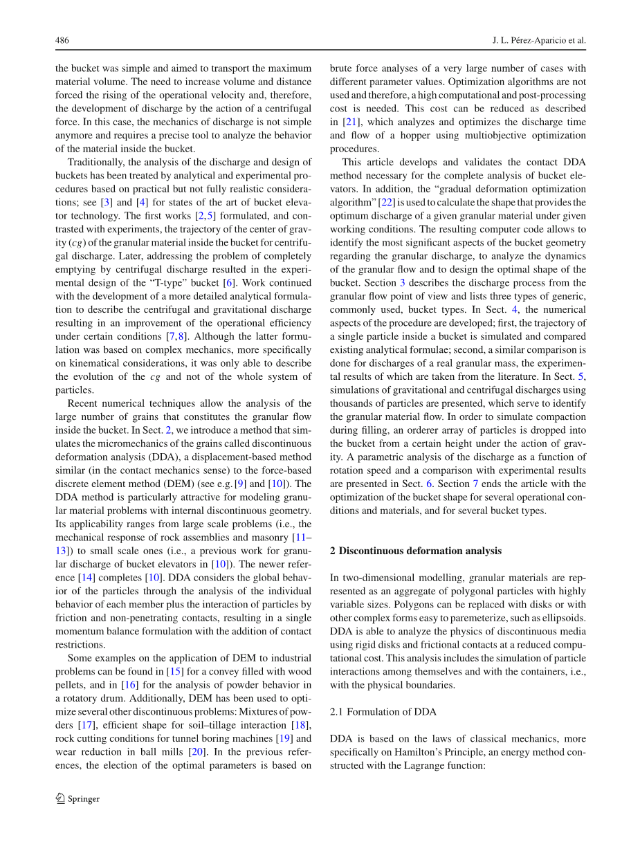 斗式提升机是运输工业和土木工程里颗粒材料的高效率运输工具。这些材料由成百上千个粒子组成,这些粒子总体上是相互排斥的。对颗粒材料运输设计的第一次尝试是连续运输,此方法没有考虑到这些相互作用,所以没有达到预期的结果。考虑到颗粒内部的不连续特性,最合理的方法是采用数值运算模拟其行为,例如,间断变形分析(DDA)——在90年代才开始用来分析类似问题的一种离散元方法。当前工作中采用的DDA格式将颗粒视为具有摩擦、阻尼和最终内聚力的刚性圆形颗粒,目的是对斗式提升机对颗粒物料的排放进行详细的模拟和分析。根据简化的解析公式和文献中的实验结果,编制了确定性计算机程序并进行了验证。然后使用该计算机代码在特定工作条件下获得最佳二维铲斗的几何形状。优化的目的是得到最大化运输距离和最小化剩余材料,同时考虑铲斗速度和颗粒特性。将生成的几何形状与标准设计进行比较 .