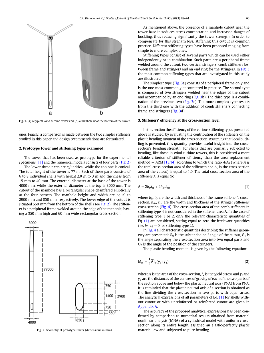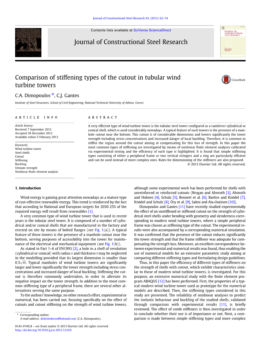 Dimopoulos和Gantes最近在实验中研究了一种非加强或加强的切口对弯曲时圆柱形钢壳的强度的影响。选择简单的外围框架作为加强型切口,其对应于现代风力涡轮机塔架的几何形状和长度。实验结果也伴随着相应的数值模拟,确定了切口的存在显着降低塔架强度,而框架加强筋足以补偿强度损失。此外,实验和数值结果之间被证明存在着的良好对应关系,从而能够使用数值模型进行广泛的参数研究,旨在比较不同的加强类型和制定设计指南。
