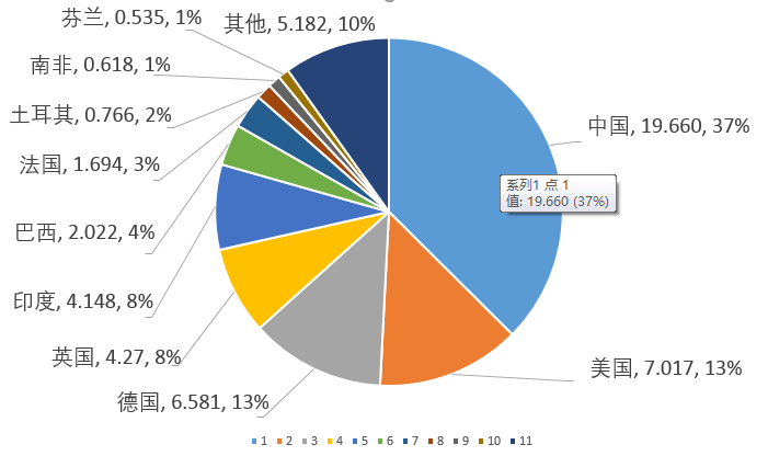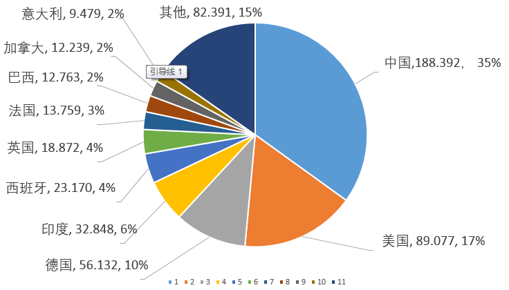查阅文献[4,5]统计资料,我们可以看到世界各国2017年风电装机容量新增容量及占比如图1.1所示,世界各国风电装机总容量如图1.2所示。