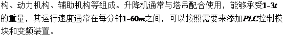 在建筑施工过程中,经常使用升降机作为辅助设备以利于建筑的建造,升降机可以像电梯一样实现上下运作,因此又被称为施工电梯或者提升吊笼。升降机的用途比较广泛,在一些高层建筑的装修或者烟囱桥梁等方面得到广泛的应用。升降机特殊的箱体结构给工作人员带来舒适和安全,在和塔吊配合工作的过程中提供了莫大的方便。