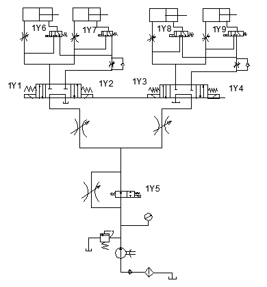 液压升降舞台的系统设计,一开始对升降舞台的作了简单的介绍;液压升降舞台的基本构造,绘制机构简图,舞台平面采用花纹钢板的材质,大小9m×3m,厚度20mm,锰钢材质的剪刀撑支架,对升降过程的演示,然后根据计算对三个运行阶段(快速上升,低速上升,下降)的负载,算出液压缸各阶段的工作压力,输入流量和功率,并计算出了缸筒内径和壁厚,活塞直径和宽度,活塞杆长度和直径等相关参数。选取节流调速回路,根据原理设计出液压系统原理图,依照原理图选择各液压元型号,最终选用了YB1-25型液压泵,Y2-132M1-6型电机,DBDS6G10型溢流阀,L-H10L型节流阀,LA-H10L型单向节流阀,3WE6G50型二位三通换向阀和4WE6G50型三位四通换向阀,然后在对所选择元件组成液压控制回路进行回路压力损失的计算,并对系统进行调压,验算温升,接着设计出升降舞台液压系统对应的电气控制图,并对此作出了详细的分析。