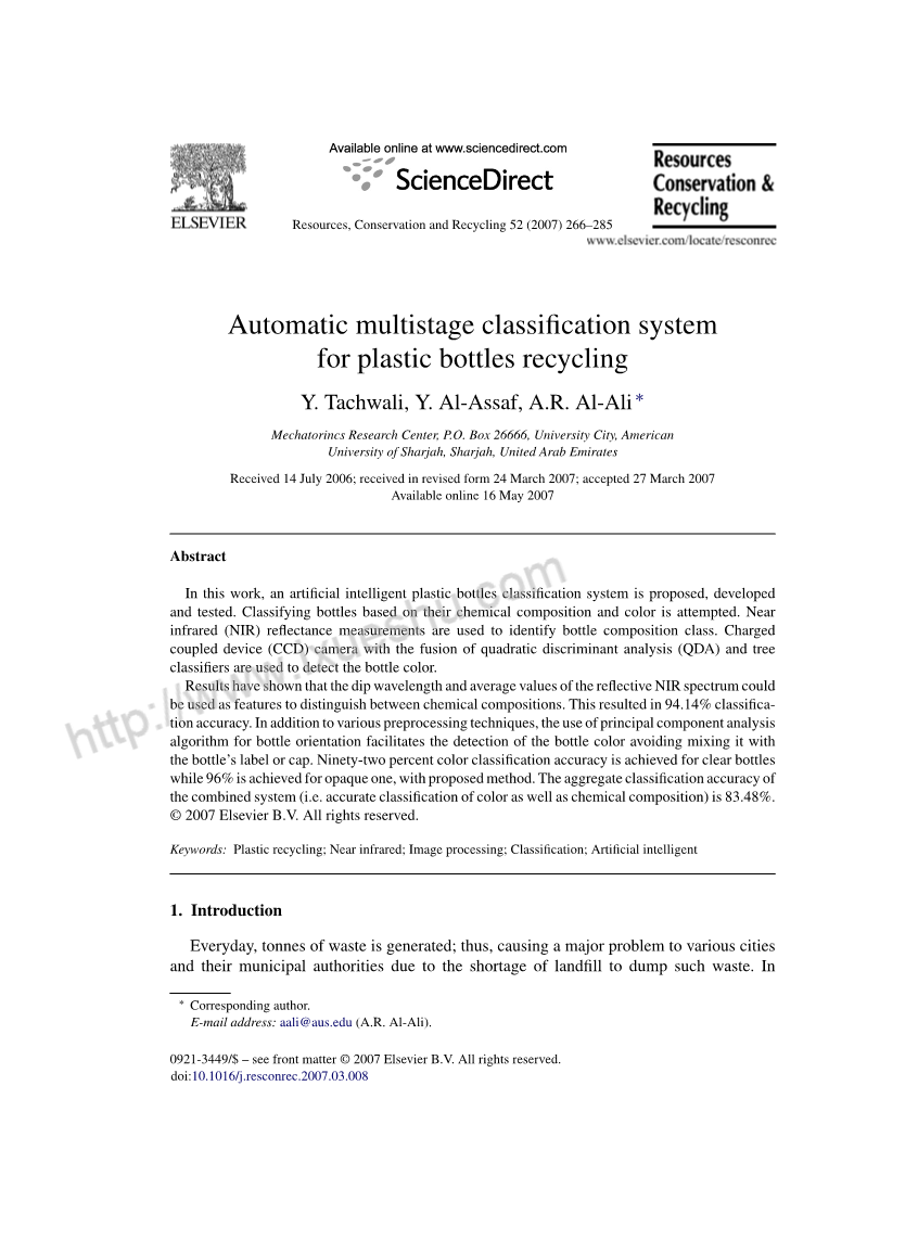 有许多技术可用于识别塑料的化学树脂,如化学方法(Hall et al。,2005),基于其密度的机械方法,如空气和水的分类或基于测量电磁频谱吸收比的电磁方法。电磁技术是唯一在塑料回收行业中广泛使用的塑料塑料识别技术。在这项工作中,我们使用近红外技术来识别塑料类型。使用近红外光谱的最显着优势可能是识别速度另一个优点是除了黑色瓶子外,颜色不会干扰正确的树脂识别。然而,将塑料瓶分类成七种不同的化学成分类型将使识别硬件上的成本增加,而通过这种更精细的分类与塑料瓶的附加值相比,其他回收行业需要通过转运分类的塑料废物已经表明,通过样品的光透射程度提供了有关聚合物类型的信息。此外,该分类还区分着色HDPE(有色)和天然HDPE。还需要进行颜色分选,以避免回收不同颜色的塑料,从而可以生产单色再生塑料此外,还有一种趋势是将一套新的颜色引入塑料瓶中虽然更广泛的颜色选择对塑料瓶营销商有利,但它带来了新的挑战并增加了塑料瓶回收的成本。