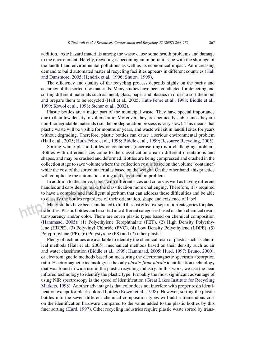 塑料瓶是城市垃圾的主要部分。由于它们的密度与体积比低,它们具有特殊的重要性。而且,它们化学稳定,因为它们是不可生物降解的材料(即生物降解过程非常慢)。这意味着塑料废物将在数月或数年内不会消失,废物将在垃圾填埋场中存放数年而不会降级。因此,塑料瓶会造成严重的环境问题。整个塑料瓶或塑料容器(宏观)的分类是一个具有挑战性的问题。具有不同尺寸的瓶子以不同的取向和形状进入分类区域,并且可能会破碎和变形。瓶子在收集阶段被压缩和崩溃以节省体积,其中收集成本基于体积(容器),而分类材料的成本基于重量。另一方面,这种做法会使自动分类和分类问题复杂化。