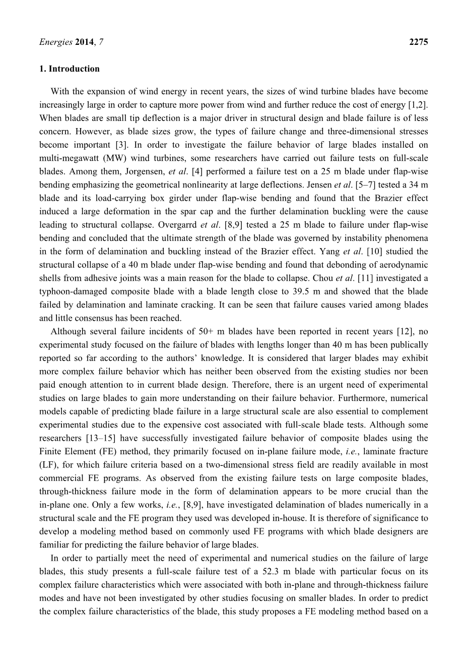 尽管近年来报道了几起50 m叶片的失效事件[12],但据作者所知,迄今为止还没有公开报道针对长度超过40 m的叶片失效的实验研究。认为大型叶片可能表现出更为复杂的失效行为,这在现有的研究中没有得到观察,在目前的叶片设计中也没有得到足够的重视。因此,迫切需要对大型叶片进行试验研究,以进一步了解其失效行为。此外,由于与全尺寸叶片试验相关的成本高昂,能够预测大型结构叶片失效的数值模型对于补充实验研究也是必不可少的。尽管一些研究人员[13–15]已经使用有限元(FE)方法成功地研究了复合材料叶片的失效行为,但他们主要关注平面内的失效模式,即层压板断裂(LF),在大多数商业有限元程序中,基于二维应力场的失效标准都是现成的。从现有大型复合材料叶片的破坏试验中可以看出,以分层形式出现的贯穿厚度破坏模式比平面破坏模式更为关键。只有少数工作,即[8,9]在结构尺度上对叶片分层进行了数值研究,并在内部开发了他们使用的有限元程序。因此,在叶片设计人员熟悉的有限元程序基础上,开发一种大型叶片失效行为预测的建模方法具有重要意义。