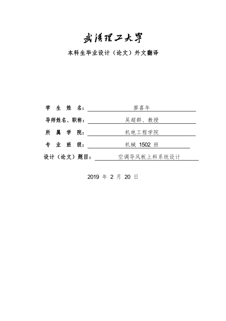 空调导风板上料系统设计外文翻译资料 2021-12-20 21:58:21 英语原文共 7 页 英语原文共 19 页资料编号:[4211] 您需要先支付 20元 才能查看全部内容!立即支付 ﰊ PREVIOUS NEXT ﰋ 您可能感兴趣的文章 基于案例的加工夹具设计的推理方法外文翻译资料 先进的开发方法的计算机辅助夹具设计的标准Fixel库外文翻译资料 旋转工作台校准的精密角度分度系统设计外文翻译资料 一个由旋转或移动组成的生产加工线系统设计外文翻译资料 高速砂轮清洗效率的实验模拟外文翻译资料 小型瓦楞纸板厂减少1/20生产周期的方法外文翻译资料 钛合金铸件的表面反应层对可磨性的影响外文翻译资料 保形纳米颗粒涂层的振动原子层沉积外文翻译资料 一种WMR避障和运动规划方法设计及试验研究外文翻译资料 400 MW汽轮机中压段调节阀的疲劳寿命预测外文翻译资料