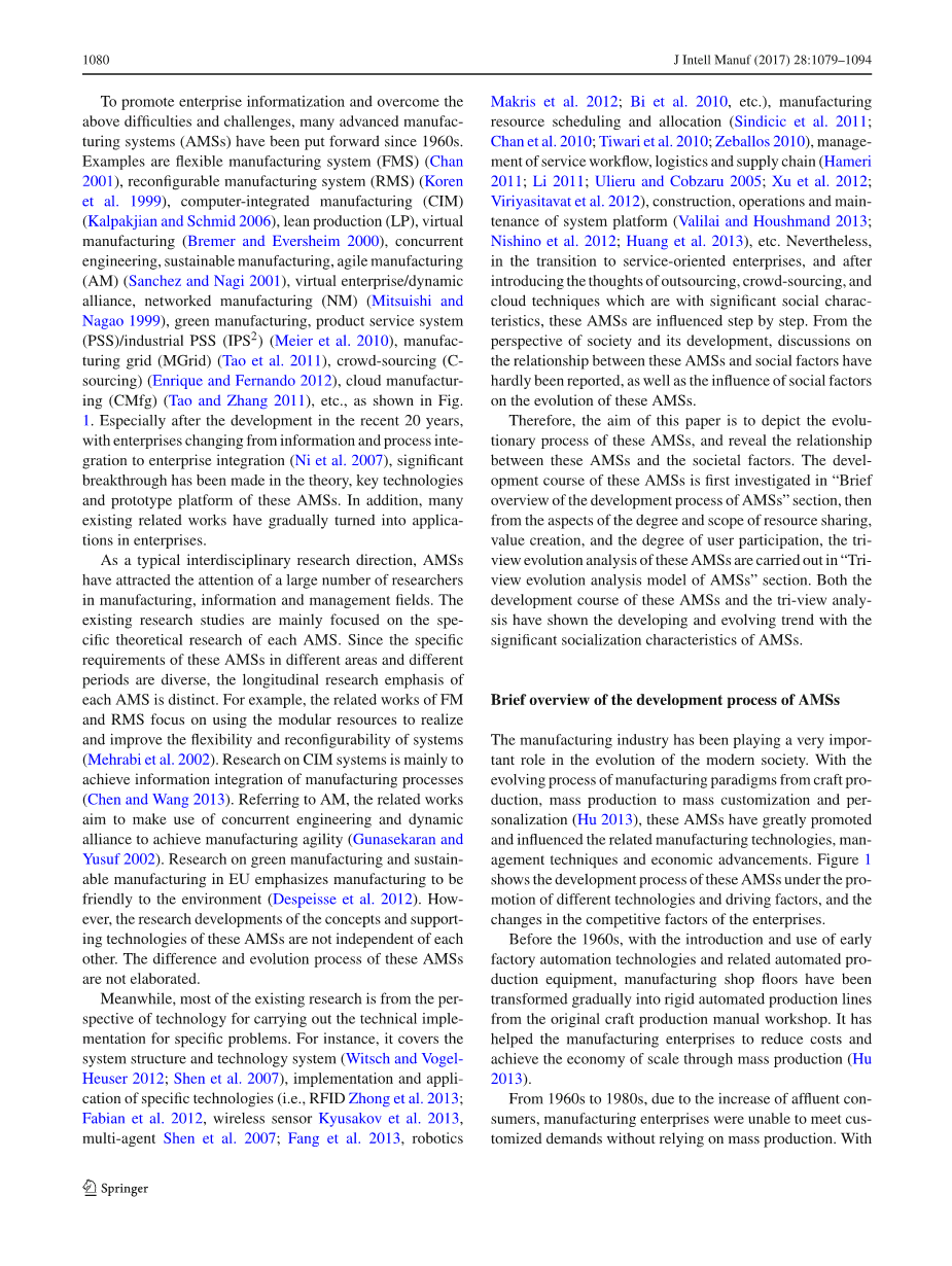 引言:近年来,随着制造业的快速发展,信息和管理技术,制造业的社会环境发生了很大的变化,如全球市场竞争日益加剧,客户多样化响应这种变化的环境,制造业和相关企业越来越关注敏捷、网络化、面向服务、绿色、社会化和其他制造特性(Kastalli和Loy 2013;RuSuko 2007;Ciin)。等。2006)。因此,这些综合要素,包括时间、质量、成本、服务、环境、灵活性、知识等。2006),逐渐成为制造企业提高企业核心竞争力保持可持续发展的关键要素。为了在激烈的竞争中生存环境,制造企业将需要重大创新,主要体现在提高企业信息化程度(2011);廉李2012)。制造业的范式企业信息化包括以下五个阶段:(a)取代纯手工操作的自动化设备;(b)组成刚性的各种自动化设备自动化生产线(沪2013),(c)自动化企业整体生产过程将出现介绍制造执行系统(HU 2013),(尤加特等。2009),(d)自动化覆盖生产系统(即,柔性或可重构制造系统)企业的业务系统是不可预测的,高频市场变化(陈2001),(KORN等)。1999)和(e)信息集成和资源共享在不同行业和企业之间的推广以满足个性化定制的需求(胡)2013)。推进企业信息化,克服企业信息化20世纪60年代以来,许多先进制造系统(AMSS)应运而生。例如柔性制造系统(FMS)(Chan)2001)可重构制造系统(RMS)(Koren)等。1999)计算机集成制造(CIM)(Kalpakjian和施密德2006),精益生产(LP),虚拟制造业(Bremer和EvsHeimm 2000),并行工程、可持续制造、敏捷制造(AM)(桑切斯和NAGI 2001),虚拟企业/动态联盟,网络化制造(NM)(Mitsuishi和长庚1999)绿色制造、产品服务体系(PSS)/工业PSS(IPS2)(Meier等)。2010)制造网格(MGET)(TAO等)。2011),如Fig.所示,人群采购(Cubices)(恩里克和费尔南多2012)、云制造(CMFG)(TAO和张2011)等。1。特别是近20年来的发展,随着企业从信息和流程整合向企业整合的转变。2007)显著突破了理论、关键技术这些AMSS的原型平台。此外,许多现有的相关工作已逐渐成为企业的应用。AMSS作为一门典型的跨学科研究方向引起了众多研究者的关注。在制造、信息和管理领域。这个现有的研究主要集中在每个AMS的具体理论研究上。既然具体不同地区和不同地区AMSS的要求时代是多样化的,纵向研究的重点是每个AMS是不同的。例如,FM的相关作品RMS注重利用模块化资源实现提高系统的灵活性和可重构性(Mehrabi等)2002)。CIM系统的研究主要是实现制造过程的信息集成(陈和王2013)。参考AM,相关作品目的利用并行工程和动态联盟实现制造敏捷性(Gunasekaran和优素福2002)。欧盟绿色制造与可持续制造研究——以制造业为例对环境友好(DePesiSE等)。2012)。然而,这些AMSS的概念和支持技术的研究进展并不独立于每个。其他。AMSS的差异与演化过程没有详细阐述。同时,现有的研究大多是从技术角度出发,针对具体问题进行技术实施。例如,它覆盖了系统结构和技术系统(WiSth和VoGelHeisher 2012;沈等)。2007)具体技术的实现和应用(如RFID等)。2013;Fabian等人。2012、无线传感器Kyusakov等。2013,多智能体Sin人。2007;方等人。2013,机器人学马克里斯等。2012;Bi等。2010等)制造业资源调度与分配(SIDICIC等)。2011;陈等。2010;蒂瓦里等人。2010、泽巴勒斯2010)服务流程管理、物流与供应链管理(Hameri)2011;李2011;尤利鲁和科布扎鲁2005;许等。2012;ViyyasasavAT等。2012)系统平台的构建、运行和维护(Valilai和HousMand 2013);尼希诺等。2012;黄等人。2013)等在向服务型企业转型的过程中介绍外包、大众采购的思想,以及云技术具有显著的社会特性,这些AMS逐步受到影响。从透视社会及其发展AMSS与社会因素的关系几乎没有报道,以及社会因素的影响这些AMSS的演化。因此,本文的目的是描述这些AMSS的演化过程,并揭示它们之间的关系。在这些AMSS与社会因素之间。这些AMSS的发展历程首先在《简报》中进行了研究。“AMSS”发展历程综述从资源共享的程度和范围,在AMSS的“三视图演化分析模型”中,对这些AMSS的三视图演化分析进行了价值创造和用户参与度分析。两个这些AMSS的发展历程和三视图分析显示了其发展和演变趋势。AMSS的显著社会化特征。