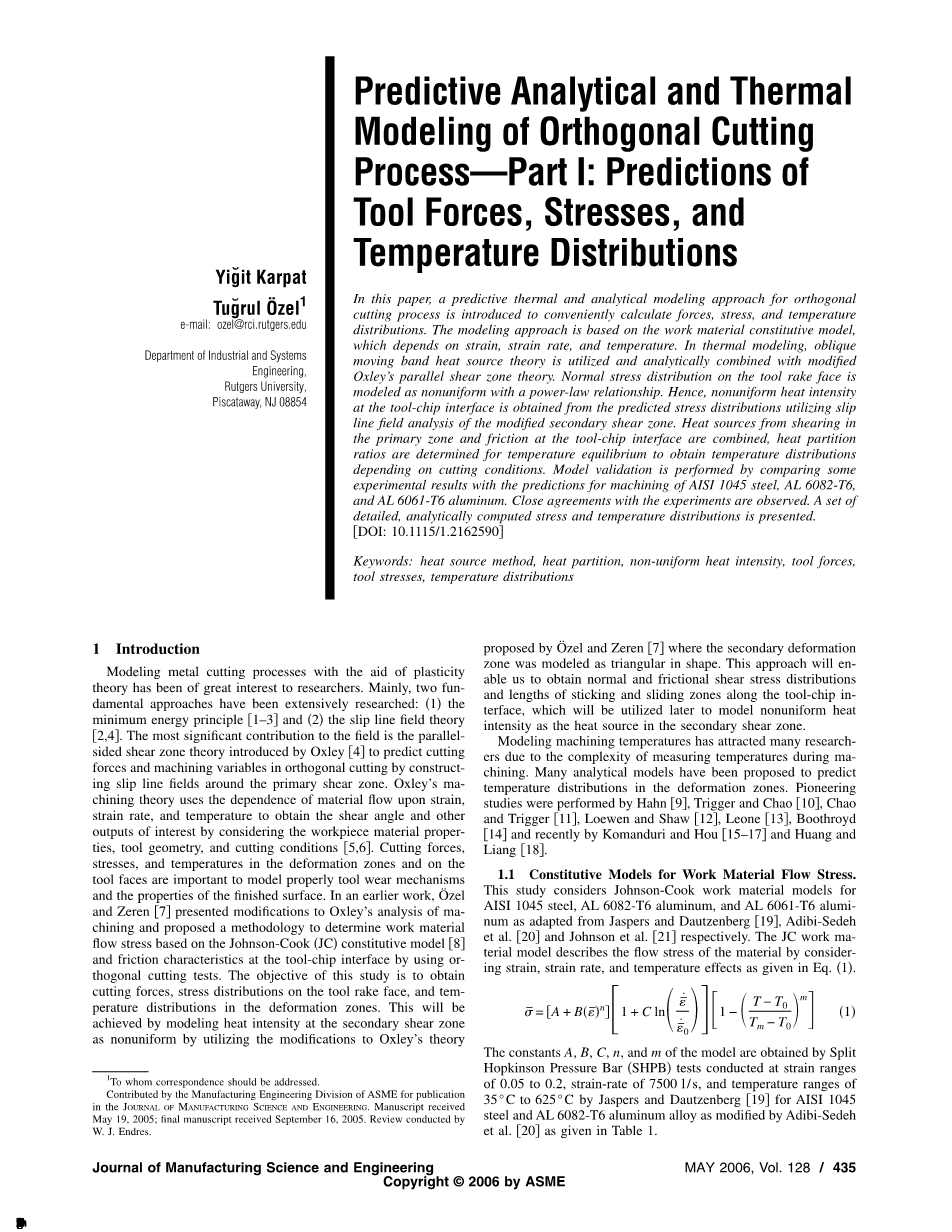 正交切削过程的热力预测分析及建模 第一部分:刀具切削力、应力及热分布预测