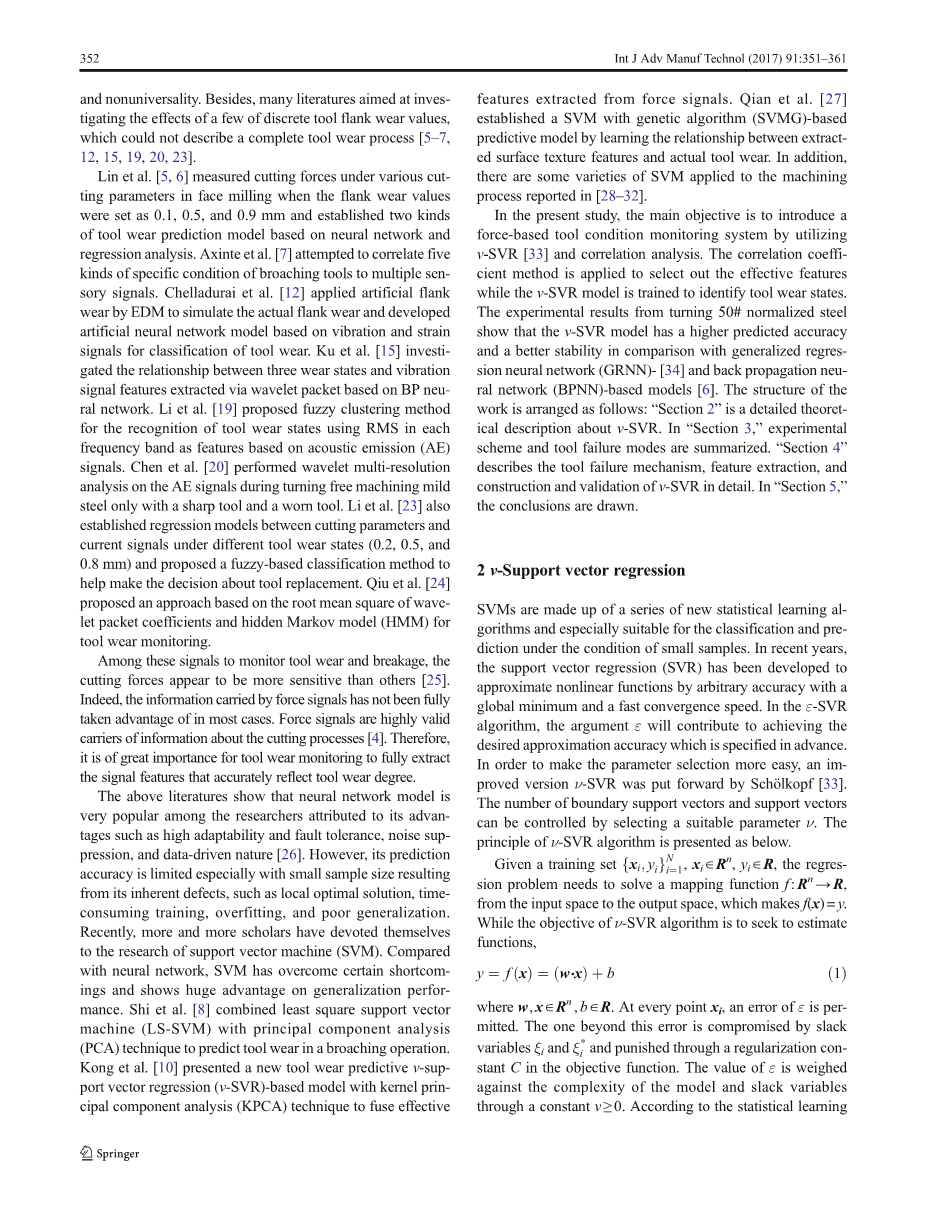 在本研究中,主要目标是通过利用v-SVR [33]和相关性分析来引入基于力的工具状态监测系统。相关系数法被用来选择有效特征,然后对v-SVR模型进行训练以识别刀具磨损状态。车削加工5号标准钢的实验结果表明,与广义回归神经网络(GRNN)[34]和反向传播神经网络(BPNN)模型[6]相比,v-SVR模型具有更高的预测精度和更好的稳定性。这篇文章的结构安排如下:“第2节”是关于v-SVR的详细理论描述。在“第3节”中,总结了实验方案和刀具失效模式。“第4节”详细介绍了刀具失效机制,特征提取以及v-SVR的构建和验证。在“第5节”中,得出结论。