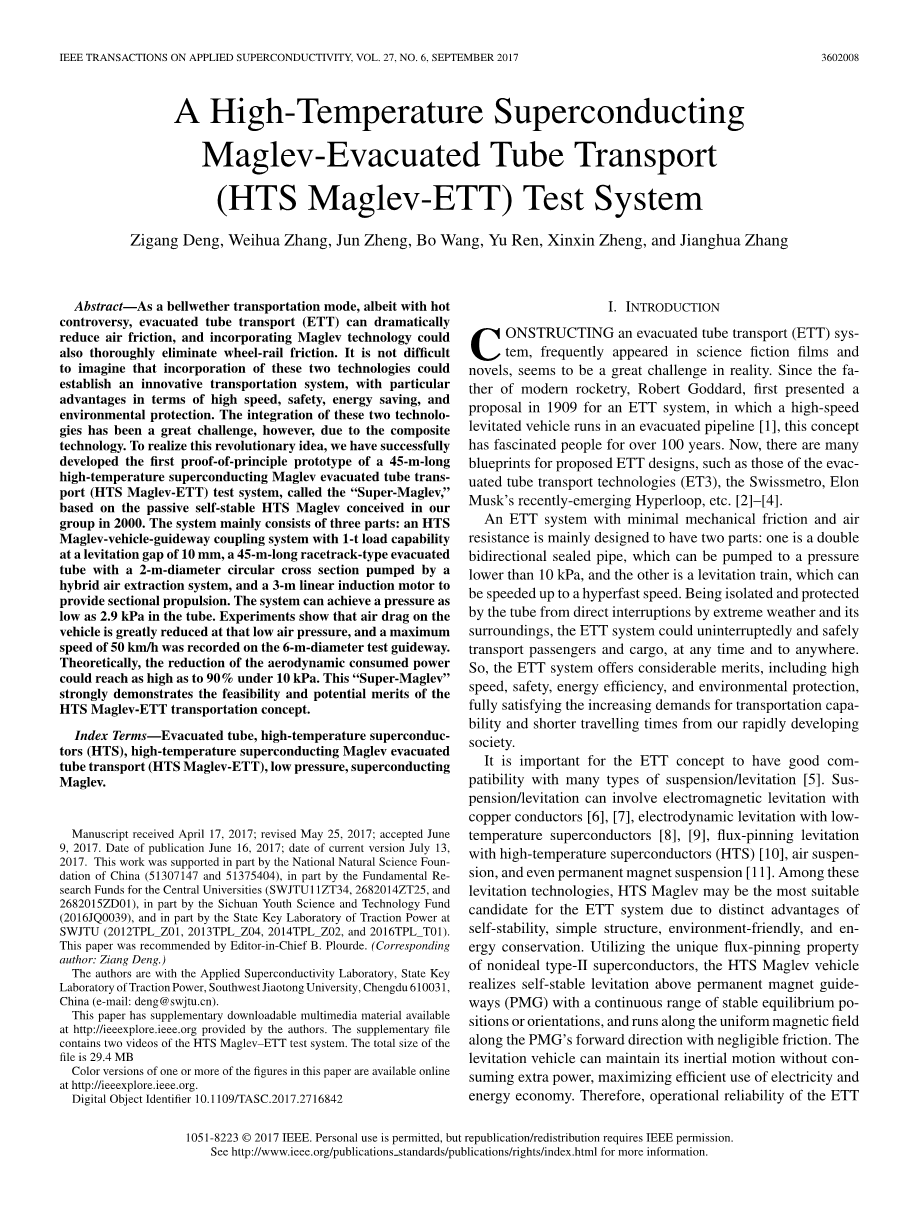 摘要:作为一种前瞻性的运输模式,尽管有着激烈的争论,真空管道运输可以极大地降低空气阻力,然后配合上磁悬浮技术,就可以完全的消除轮轨摩擦。并不难想象,将这两种科技相结合就可以创建一种创新的,并具有某些特定优势诸如高速、安全、节能和环保的运输系统。然而,由于复合技术,两种技术的相结合一直是巨大的挑战。为了实现这个革命性的想法,我们已经成功建立了第一个原理上可行的45米长的高温超导磁悬浮真空管道运输系统原型,叫作“Super-Maglev“,它是基于我们小组于2000年所设想出的被动自稳的高温超导磁悬浮。这个系统主要由三个部分组成:一个HTS磁悬浮列车轨道耦合系统,其在10mm的悬浮间隙时具有1吨的载重能力;一个45m长的跑道形真空管道和一个截面为直径2m的圆形的混合空气抽取系统;和一个3m的直线感应电机来提供分段推进。系统的管道可以达到最低2.9kPa。实验显示空气对列车的阻力在低气压显著减小,在直径为6m的测试轨道上,一个最大时速为55km/h被记录。理论上说,在10kPa下,空气阻力消耗的能量最高可减少90%。这个“Super-Maglev“很明显地显示了高温超导磁悬浮真空管道运输概念的可行性和潜在的价值。