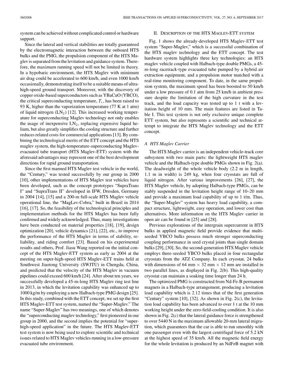 图1展示了已经建好的HTS Maglev-ETT测试系统“Super-Maglev”,它成功地将高温超导磁悬浮技术和真空管道运输概念相结合。测试系统的硬件强调了三个关键技术:一个采用双Hallbach型永磁轨道的HTS磁悬浮;一个45米长的跑道状真空管道,其由混合空气抽出设备抽成真空;和一个与实时监控组件匹配的推进电机。迄今为止,在相同的推进系统下,尽管有实验轨道的高曲率的限制,列车最大速度由在环境气压下的25km/h提升到0.1个大气压的低压下的50km/h,而且装载能力在测试下高达1吨,此时悬浮高度为10mm。主要的特征列于表I。这个测试系统不仅是独一无二的完成的ETT系统,而且也代表了一次将HTS磁悬浮技术和ETT概念相结合的科学上和技术上的尝试。